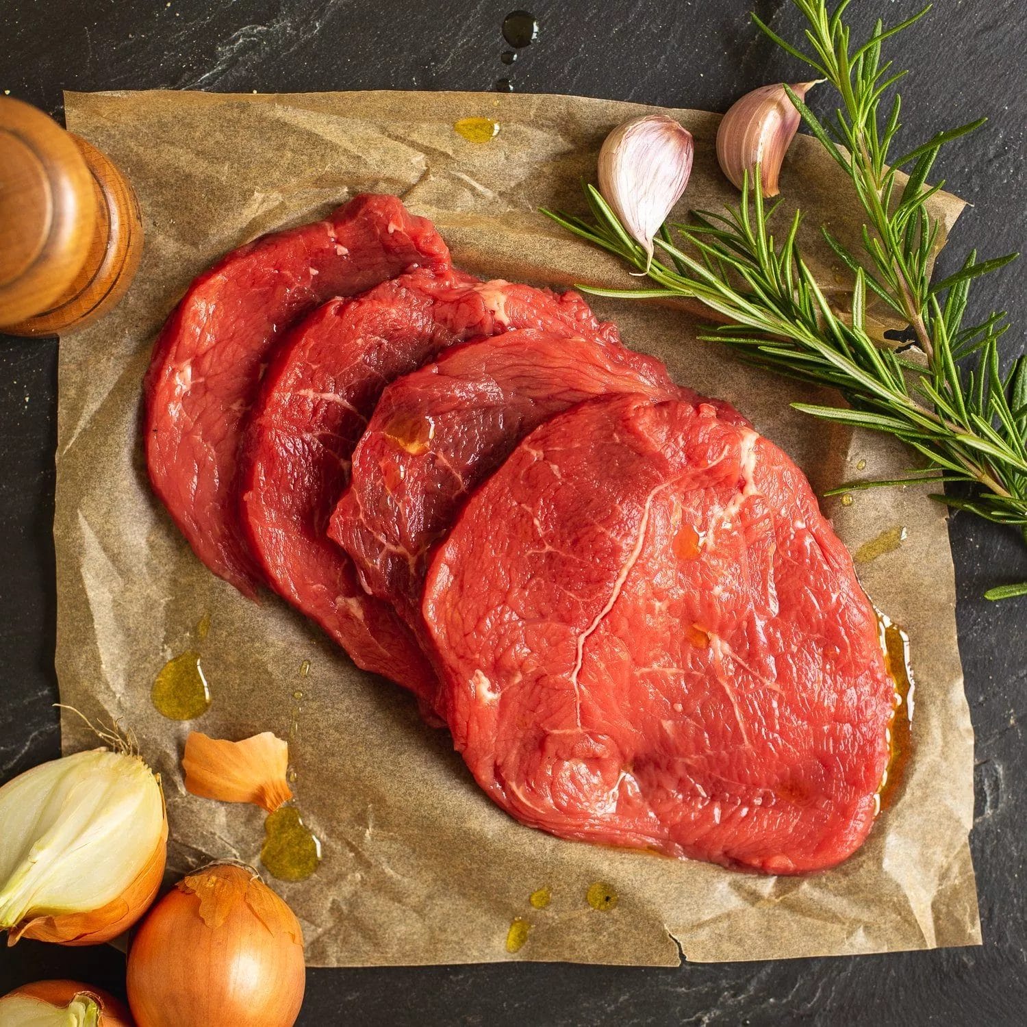 Las escalopas asiento vacuno son de intenso color rojo oscuro, poseen muy poca grasa y se ubican fácilmente en una zona muy cercana a la punta picana y el lomo liso, ambas limitan por abajo y por delante respectivamente.
